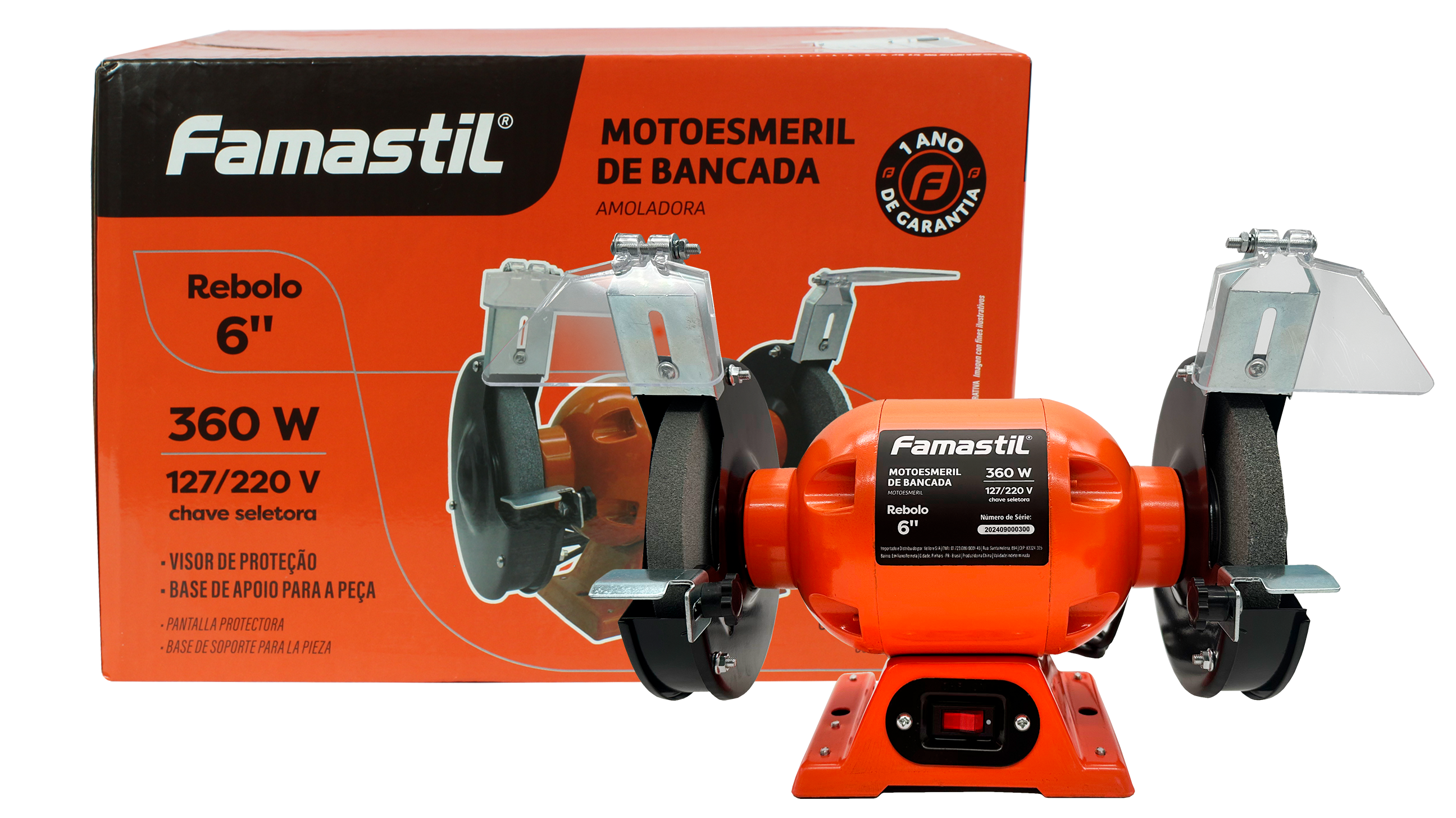 O Motoesmeril de Bancada Famastil combina potência, versatilidade e durabilidade, sendo perfeito para serviços de afiação, desbaste e acabamento, além de arredondamento de cantos, remoção de ferrugem e rebarbas, polimentos e afiação de peças e ferramentas metálicas.